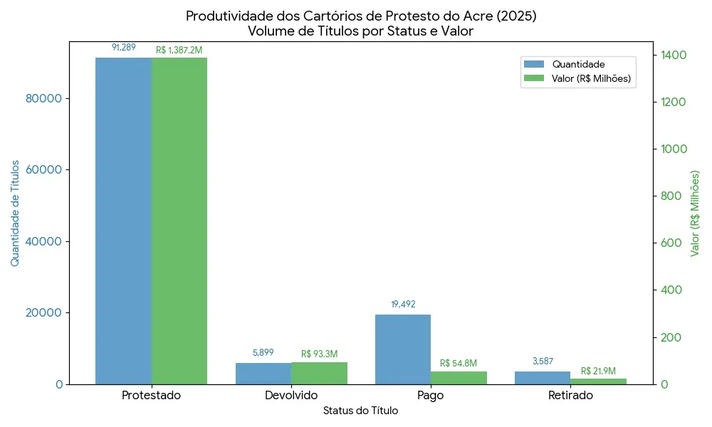 Os dados mais detalhados apontam que 19.492 títulos foram quitados, representando 17,03% do total processado, com um valor aproximado de R$ 54,8 milhões. Além disso, 3.587 títulos foram retirados após negociações, somando cerca de R$ 21,9 milhões. Ao todo, 91.289 títulos foram efetivamente protestados, correspondendo a 79,78% do total processado, concentrando R$ 1,38 bilhão em valores.