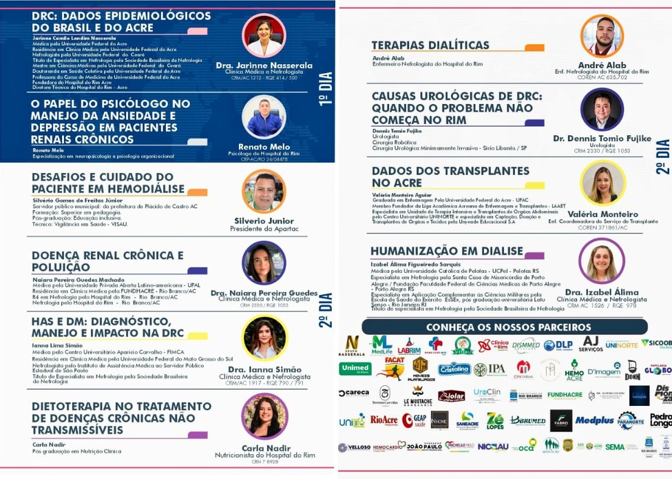 A programação inclui uma exposição sobre causas urológicas da DRC, conduzida pelo urologista Dennis Tomio Fujike, um especialista em cirurgia robótica com formação pelo Hospital Sírio-Libanês, em São Paulo. Outro ponto alto será a apresentação de dados sobre transplantes realizados no Acre, feita pela enfermeira Valéria Monteiro Aguiar, uma especialista em terapia intensiva e transplantes de órgãos abdominais, além de membro fundadora da Liga Acadêmica Acreana de Enfermagem e Transplantes.
